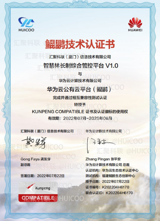 匯聚科聯(lián)自主研發(fā)的“智慧林長制綜合管控平臺1.0”與華為云計算技術(shù)有限公司的華為云公有云平臺(鯤鵬)完成并通過相互兼容性測試認(rèn)證,正式獲得華為鯤鵬技術(shù)認(rèn)證書